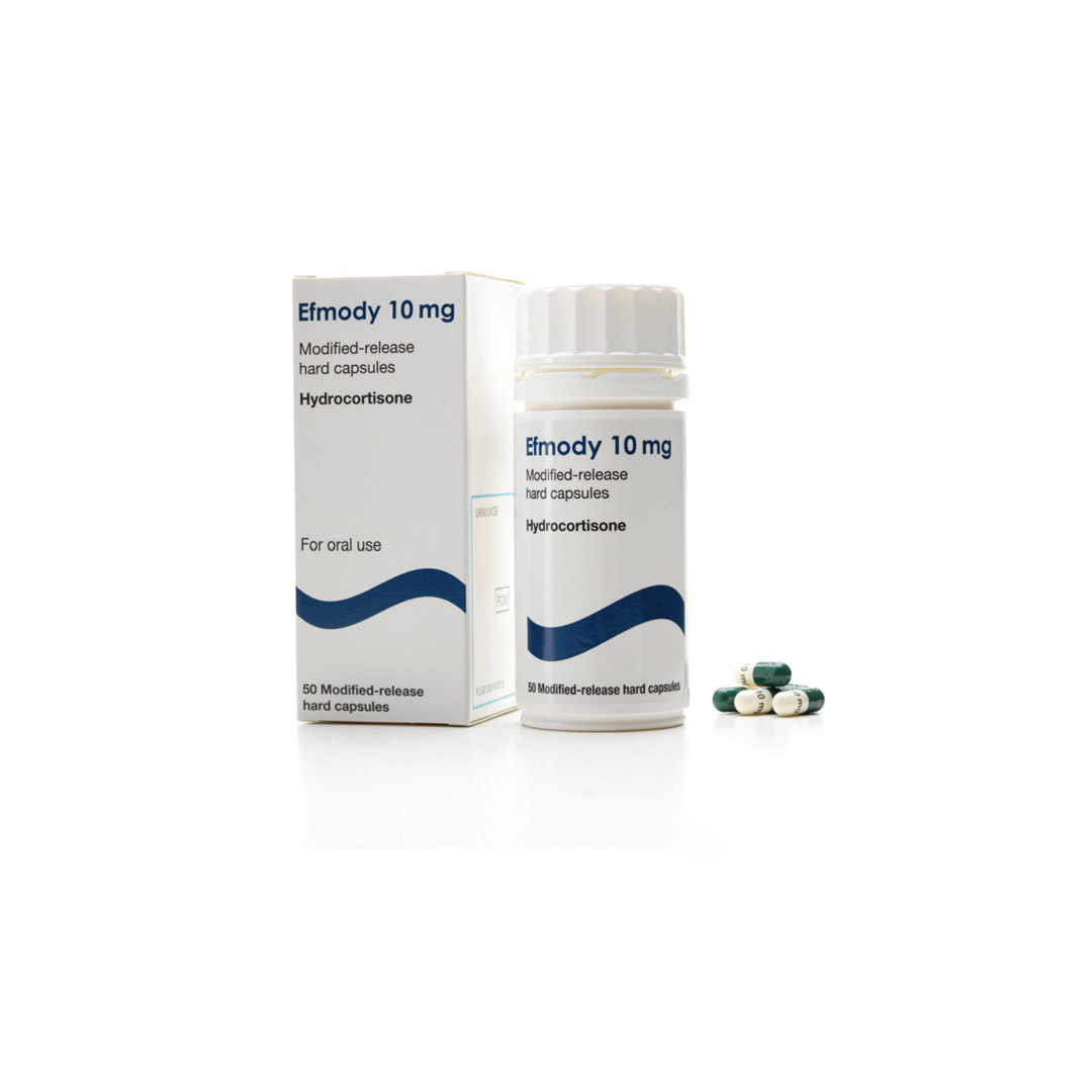 Efmody® est vendu en flacon de 50 capsules à libération modifiée. Chaque capsule contient de l’hydrocortisone et est disponible en deux dosages : 5 mg et 10 mg.